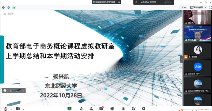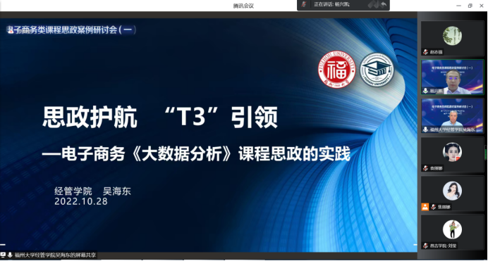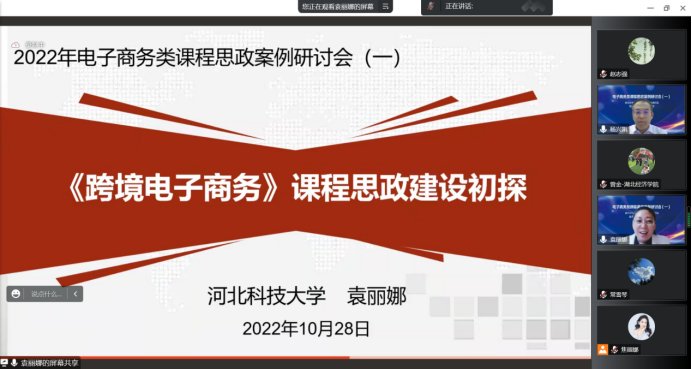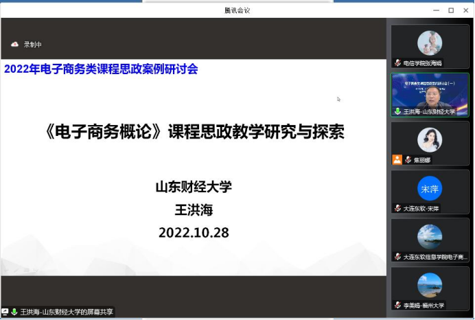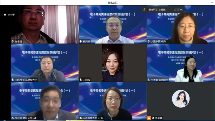 为充分运用信息技术,形成基层教学组织建设管理的新思路、新方法、新范式,充分调动教师的教学活力,落实教研室成员协同共建人才培养方案、教学大纲等教学资源,形成优质共享的教学资源库。电子商务系依托教育部电子商务概论课程虚拟教研室、重庆市电子商务虚拟教研室,全体教师在2022年10月28日20:00在线参加了电子商务类课程思政案例研讨会。本次沙龙活动旨在落实虚拟教研室开展常态化教师培训,发挥教学团队、教学名师、一流课程的示范引领作用,推广成熟有效的人才培养模式、课程实施方案,促进一线教师教学发展。本次研讨会由东北财经大学杨兴凯教授主持。