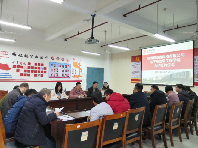 2020年11月26日下午,yl6809永利官网与陕西鑫卓青科技有限公司就合作事宜进行座谈,并举行合作签约仪式。院长陈守满、副院长王克刚、办公室主任、系(教研室、中心)主任、电子信息工程系和物联网工程系的全体教师出席了座谈会。