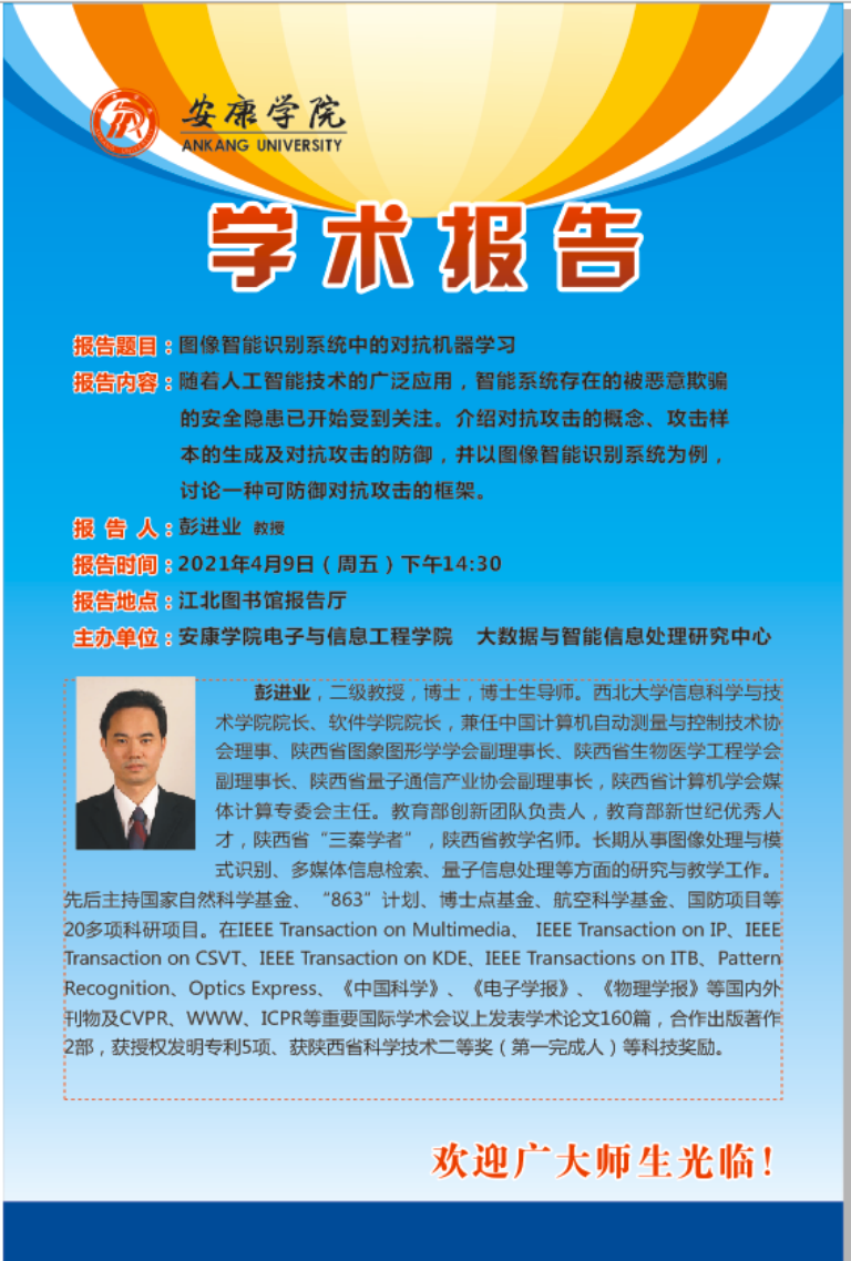 具有中青年博、硕士教师为骨干的科研队伍。现有陕西省高等学校重点实验室1个省级科研平台,安康市饮用水处理工程技术研究中心1个市级研究平台,电子信息技术研究中心、大数据与智能信息处理研究中心2个校级研究平台。