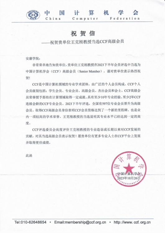 近日,中国计算机学会(CCF)向我校发来贺信,祝贺我校yl6809永利官网王克刚教授当选CCF高级会员,同时欢迎我校有更多计算机专业人士在CCF平台上发展,并取得优异的成绩。