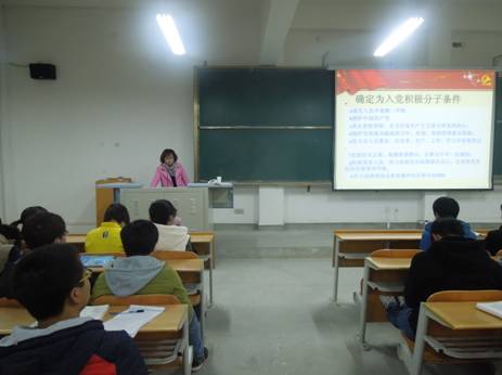 12月18日晚上,电子信息工程系党总支在1301教室召开了2014级新生入党启蒙教育。由系学生党支部书记成英丽老师主讲。会上,成英丽老师首先为大家介绍了中国共产党的性质、党员的权利与义务等基础知识;接着阐述了什么是入党动机、如何端正入党动机,要求有入党意愿的同学应尽快适应大学学习和生活,在学习和实践中提高自己的思想政治素养,不断纠正和净化自己的入党动机,树立坚定的政治信仰,不断追求进步,从多方面提升自己。讲座中成英丽老师还介绍了电子信息工程系学生党支部的基本情况、入党流程,并为大家讲解了入党申请书的书写格式。最后,她鼓励每位有入党意愿的同学树立目标,努力实践,争取早日成为一名光荣的中国共产党党员。