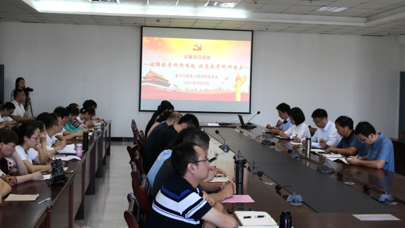 为推进党史学习教育同日常工作相结合,党建工作与业务工作相结合,以高质量的党建促进高质量发展,达到学史明理、学史增信、学史崇德、学史力行。2021年9月22日,yl6809永利官网教工第一、二党支部联合在yl6809永利官网江北校区逸夫科技楼9楼开展了“破解教学科研难题,提高教学科研能力”的主题党日活动。yl6809永利官网党总支下设的教工、学生党支部全体党员和学院非党员老师,副校长张东红以普通党员的身份全程参加了本次主题党日活动,主题党日由yl6809永利官网教工第二党支部书记余顺园主持。
