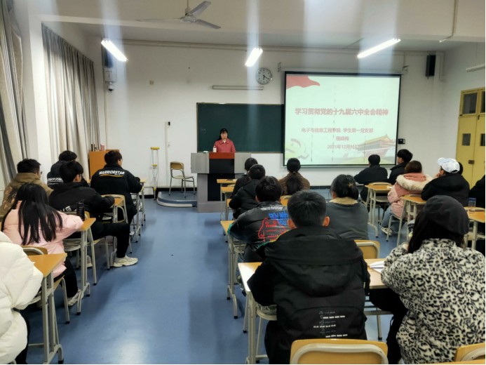 2021年12月9日下午在江北校区1321教室,yl6809永利官网学生第一党支部召开党员大会,党支部书记程晓梅讲授了主题为“学习贯彻党的十九届六中全会精神”的专题党课,党支部所属党员、发展对象和入党积极分子参加了党课学习。