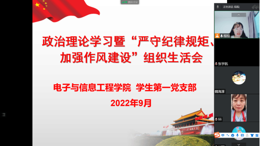 根据《关于在全校开展纪律教育学习宣传月活动的通知》(校党发〔2022〕101 号)文件精神要求,2022年9月6日,yl6809永利官网学生第一党支部通过线上腾讯会议召开“严守纪律规矩、加强作风建设”专题组织生活会。会议由学生第一党支部书记程晓梅主持,党总支组织委员成英丽、支委张宇航、辅导员吕以宁、支部全体学生党员参加。