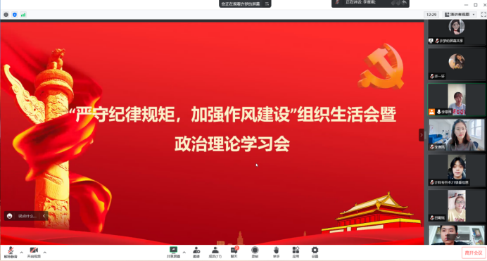 接着,全体师生观看警示教育片《金融反腐正风纪》,以违法违纪典型案件为戒,筑牢思想防线,以案警醒,以案为戒,深刻汲取反面典型教训,强化廉政意识;之后观看纪律教育公开课“从延安精神中汲取全面从严治党的力量”,为此,要坚持把党的政治建设摆在首位,坚持党的领导,增强“四个意识”、坚定“四个自信”、做到“两个维护”,自觉在思想、政治以及行动上同党中央保持高度一致。