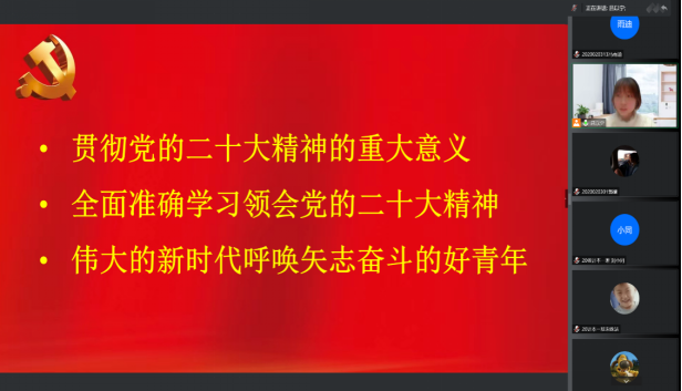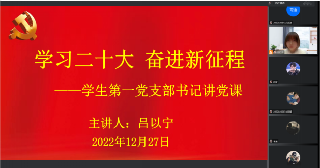 2022年12月27日yl6809永利官网学生第一党支部书记吕以宁通过线上腾讯会议平台,以学习党的二十大精神为主题,为学生第一党支部全体学生党员上了一堂生动的专题党课,推动党的二十大精神学深悟透、落到实处。