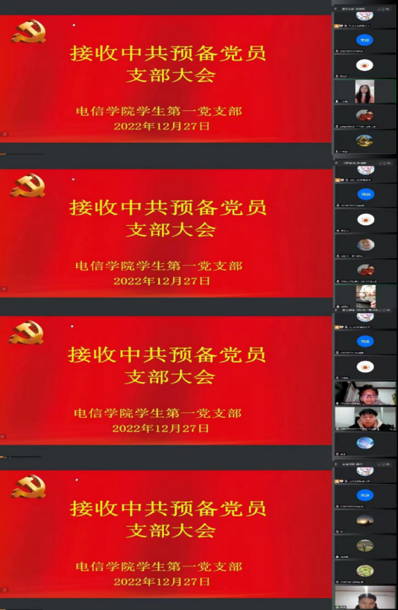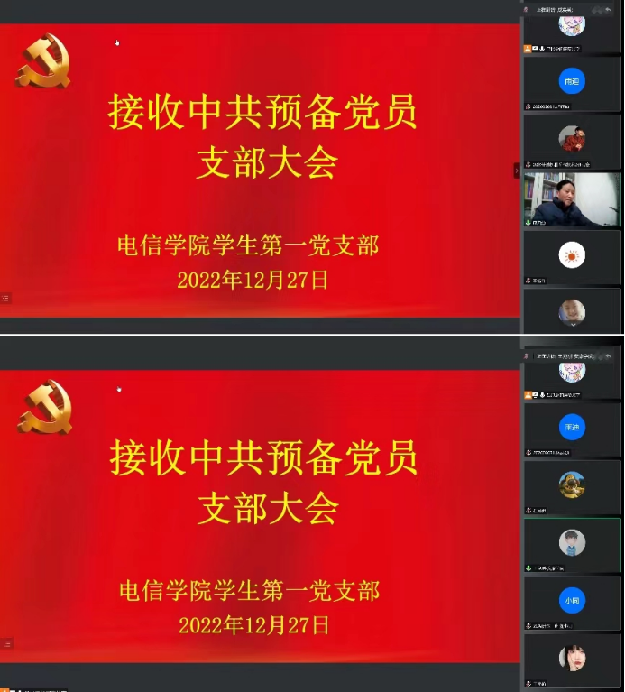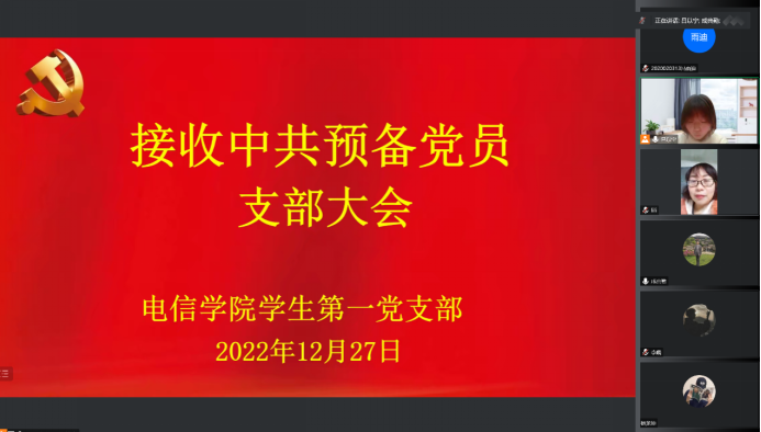 12月27日晚上7点,yl6809永利官网学生第一党支部采用线上腾讯会议的形式召开了中共预备党员接收大会,会议主要讨论了吴皓阳等9名中共预备党员的转正事宜。yl6809永利官网学生第一党支部书记吕以宁,党总支组织(纪检)委员成英丽,支部组织(纪检)委员张宇航,入党培养老师王克刚、成典勤以及支部学生党员和本期发展对象参加了会议。会议由吕以宁主持。