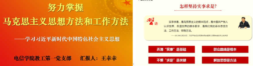 接着,教工第一党支部宣传委员王幸幸以“弘扬教育家精神,坚守立德树人使命”为题为支部党员教师讲党课。她表示,习近平总书记十分重视方法论问题,不仅重申了马克思主义的基本方法,而且提出了新的方法原则,丰富了马克思主义方法论宝库。学习习近平新时代中国特色社会主义思想,不仅要掌握其丰富的思想观点,而且要掌握贯穿于其中的思想方法和工作方法,并用以指导自己的学习和工作。