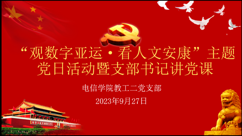 9月27日下午,yl6809永利官网教工二党支部在逸夫科技楼B702开展了“观数字亚运·看人文安康”主题党日活动暨支部书记讲党课。活动由支部书记丁礼磊主持,支部全体党员参加了本次活动。