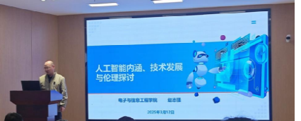接着,教工第一党支部书记赵志强按照“五联五做”工作要求,认真落实结对工作,做学生党员成长的呵护人。他以《人工智能内涵、技术发展与伦理探讨》为题做了一场专题报告。他从人工智能的历史发展讲起,详细阐述了从低谷到突破性进展的艰辛历程,并着重介绍了当前人工智能技术的蓬勃发展,如机器博弈智能、机器创造智能等领域的创新应用。他还深刻剖析了人工智能技术的伦理问题,探讨了人与智能系统、智能机器之间的新型道德关系。他强调,在推动人工智能技术发展的同时,必须坚守伦理道德底线,确保技术发展成果惠及全人类。与会人员通过聆听报告不仅加深了对人工智能技术的理解,也为个人如何学好、用好人工智能技术,赋能党建和学生工作打下了基础。