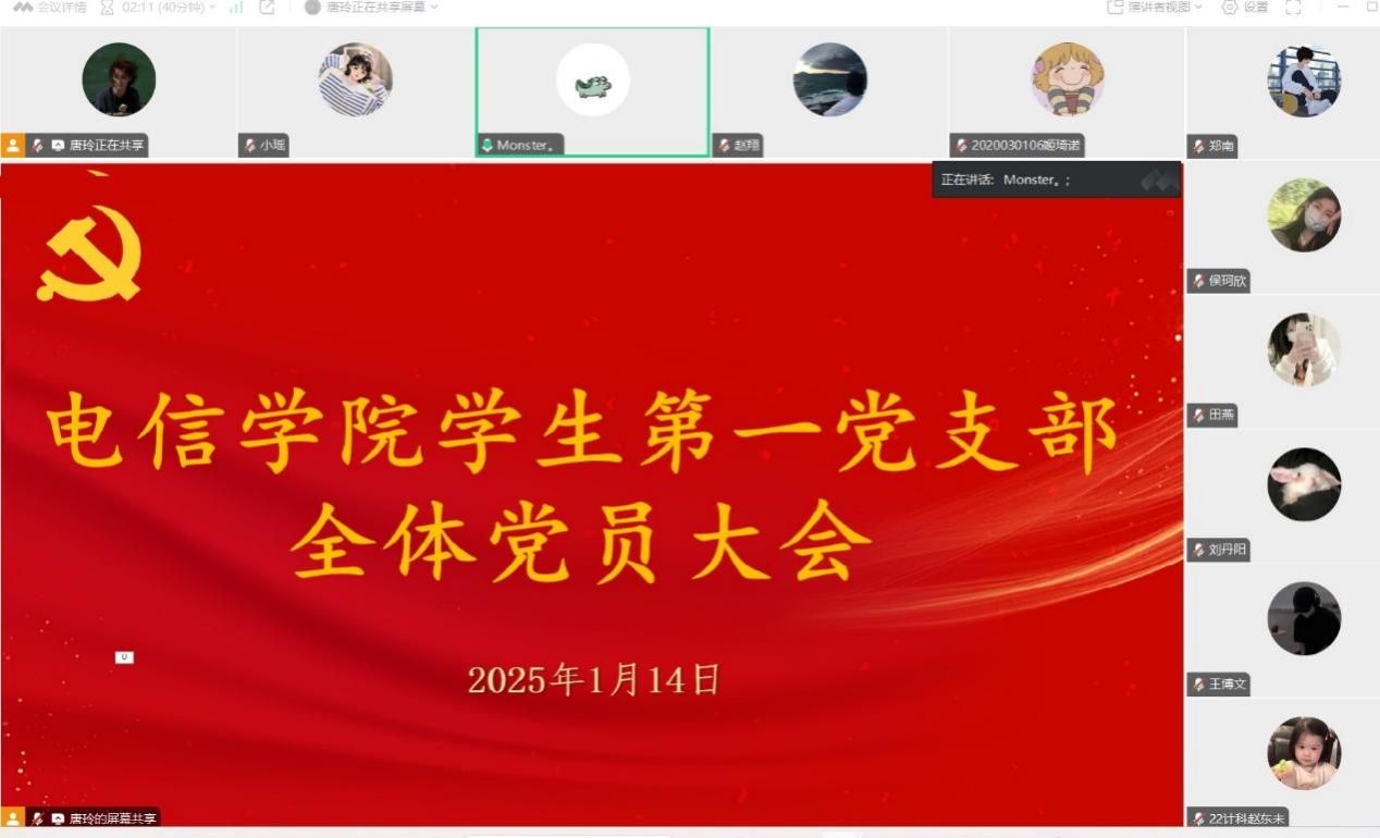 为深入学习贯彻党的二十届三中全会精神和全国教育大会精神,坚定不移推进全面从严治党向纵深发展,增强党员的纪律意识,根据中共yl6809永利官网委员会《关于召开2024年度组织生活会和开展民主评议党员工作的通知》的相关要求,yl6809永利官网学生第一党支部于1月14日通过线上的形式召开党员大会开展2024年度组织生活会暨民主评议工作。会议由党支部书记翟子轩主持,全体党员参与。