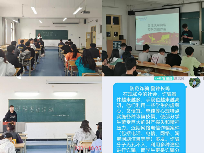 辅导员张宇航主要通过线上线下相结合的方式开展此次班会。针对2018级在外实习同学召开线上会议,通过精心制作的校园防诈宣传文稿来分析典型诈骗案例让学生了解有关校园贷、黑中介、杀猪盘、网络刷单等行骗手段,并给出了一定的防范意见针对在校学生开展主题宣讲和班级讨论相结合的方式向同学们普及防诈知识。同时,向同学们分发、讲解防范电信网络诈骗宣传手册,并通过实际案例、现场模拟等形式向同学们生动讲解诈骗集团的常用作案手段,展示了电信网络诈骗的过程和危害。活动最后,2020级各位同学发表了自己的感受与收获,并向大家分享了自己的经验与经历。