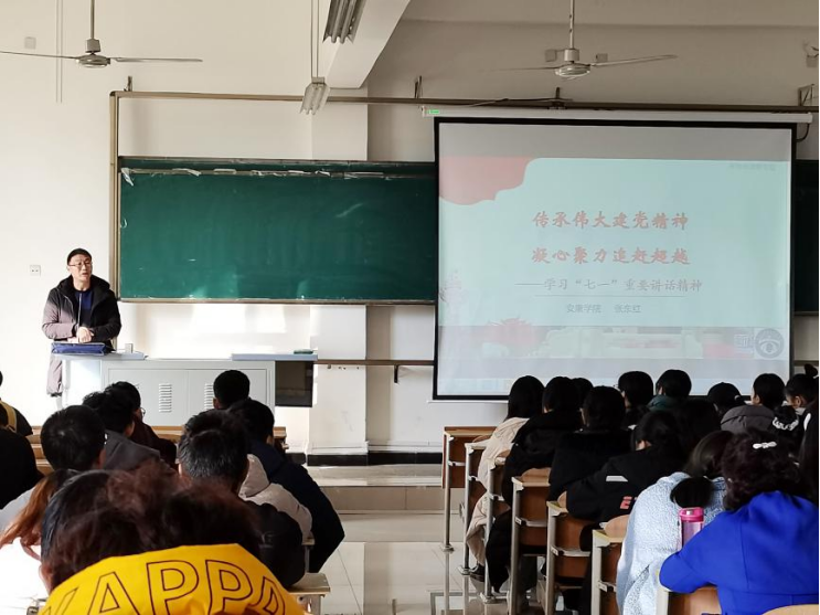 2021年12月1日下午,学校党委委员、副校长张东红教授在江北1304教室为yl6809永利官网学生讲述了一堂生动的《形势与政策》课。主题为“传承伟大建党精神 凝心聚力追赶超越——学习‘七一’重要讲话精神”。参加此次课程的是yl6809永利官网2020级和2021级学生党员、发展对象、入党积极分子。本次形势与政策课由yl6809永利官网党总支组织委员成英丽主持。