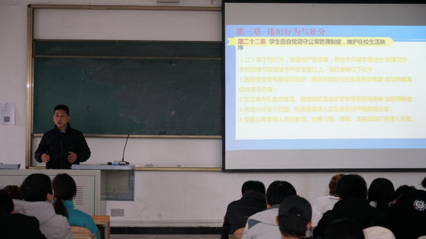 之后,为加深学生思想行为和意识形态认识,蔡正旺详尽说明了《yl6809永利官网学生违纪处分办法》,该办法共有六章四十五条,内容涉及违纪处分办法的制定的依据,坚持的原则,处分的种类、期限和适用,违纪行为及处分、处分程序与执行、学生申诉等方面。他指出要坚持教育和惩戒相结合的原则,对违纪学生做出违纪处分是为了教育学生,是为了大家更好的在大学里学习。学生对违纪处分如有异议,可在规定时间内向学校提出申诉,并说明了申诉的方法和途径。学校制定的这些“规矩”是为让学生们避免行为误区触及处罚的底线,同时为了告诫大家,蔡正旺还语重心长的强调了学校禁止的各种行为,并结合现在的疫情形式,着重谈了离校报备、健康打卡、做好疫情防控的重要性。