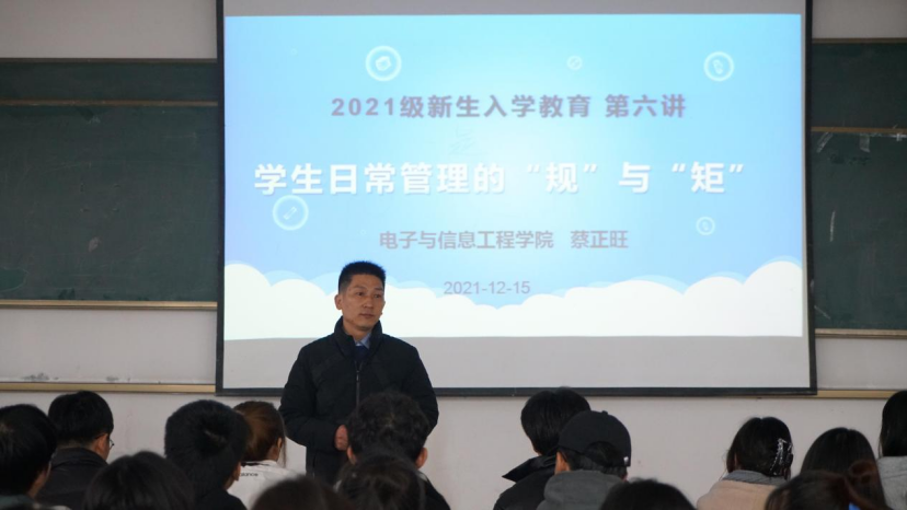 2021年12月15日下午,yl6809永利官网在1204教室开展了新生入学教育第六讲,本次讲座主题----学生日常管理中的“规”与“矩”。2021级全体新生参加讲座,本次讲座由yl6809永利官网党总支副书记蔡正旺老师主讲。