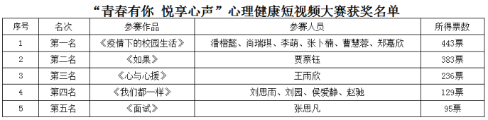 本次心理健康短视频大赛历时21天,全校共有429名学生报名参与。比赛中,参赛选手根据心理健康教育主题以创编歌曲、舞蹈、手语操、减压小故事、校园情景剧、小品、脱口秀、微电影等形式,围绕大学生日常生活、校园活动、学习、恋爱、择业、人际交往等方面所折射出的心理问题现象进行视频制作。作品内容积极健康向上,具有一定教育意义,发挥了正确引导作用,能够弘扬主旋律,传播正能量,富有青春朝气。初赛阶段学生以个人或团体参赛的形式共提交77件作品,经过评审组初步审核、评定,其中16个作品进入复赛。5月25日至5月30日,进入复赛的作品通过yl6809永利官网微信公众号(安大dxxy)公布并发起线上投票活动,最终以作品所得票数决定比赛排名。排名如下: