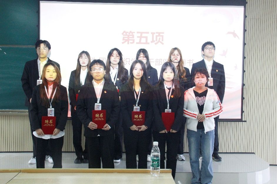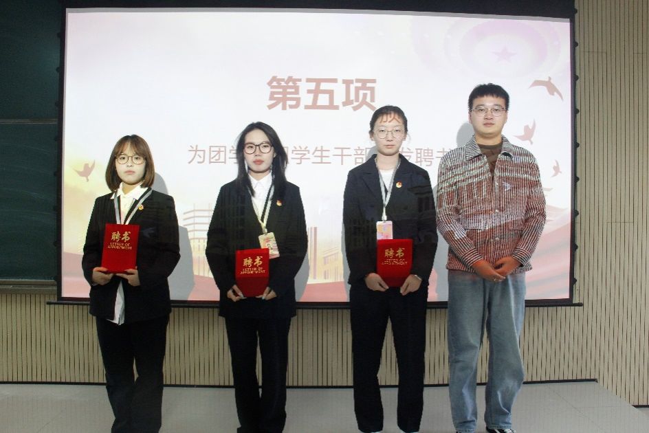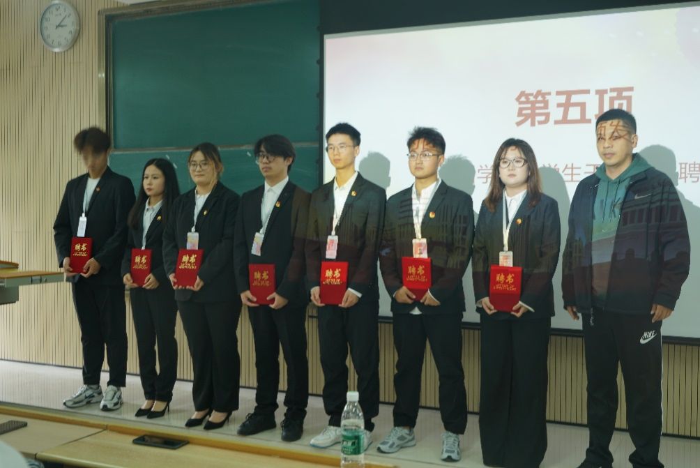 接着由团总支书记张宇航,学工办主任石纭昊,辅导员成英丽,辅导员贾金兵为yl6809永利官网学生组织各部门负责人颁发聘书,之后由团学组织干部向各部门干事进行授牌。同时,在学生分会轮值主席赵晓羽的带领下,第37届学生组织全体干部庄严宣誓,坚定了全心全意为同学服务,为yl6809永利官网高质量发展挺膺担当的决心。