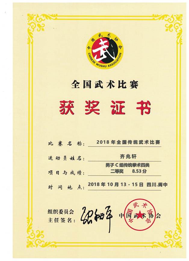 我院2015级电子信息工程专业学生齐兆轩在2018年四川阆中全国传统武术比赛获得佳绩。