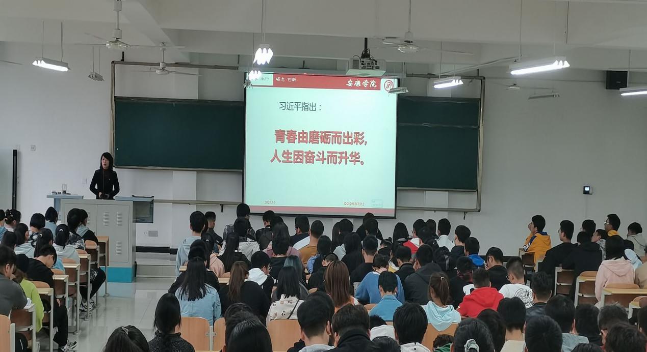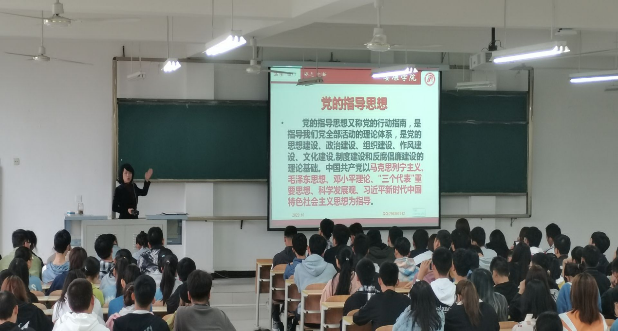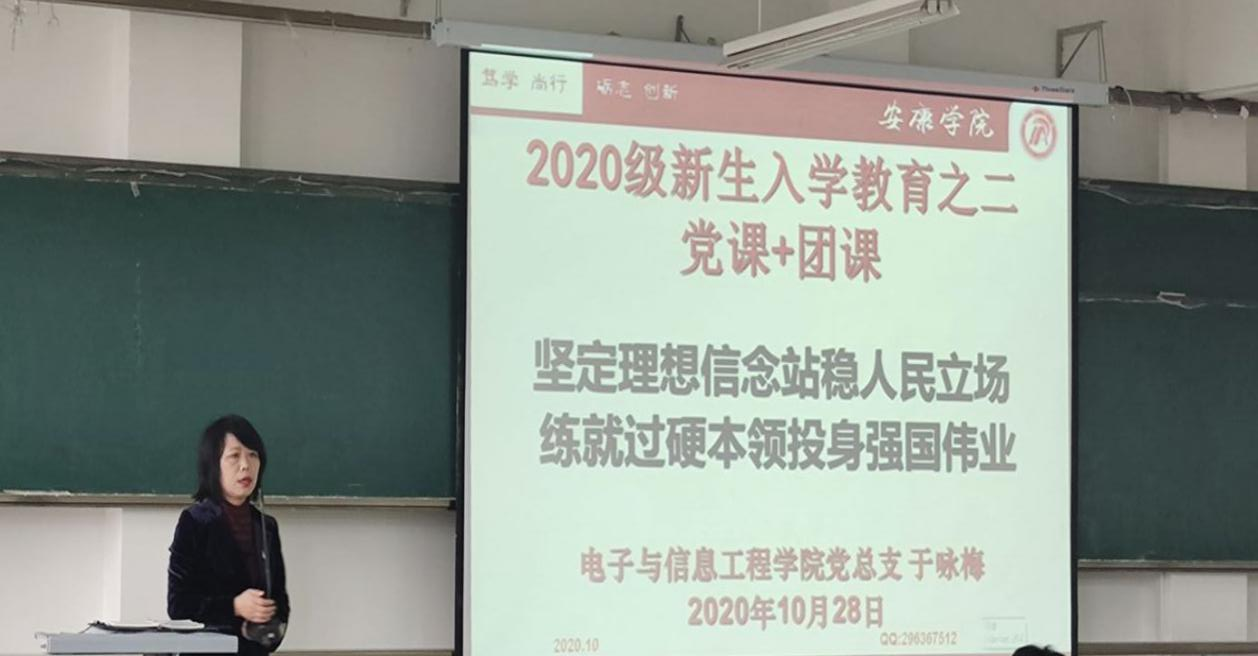 1028日,yl6809永利官网在江北1301教室开展了主题为坚定理想信念站稳人民立场,练就过硬本领投身强国伟业的入学教育第二讲,党总支书记于咏梅主讲,全体2020级新生参加。