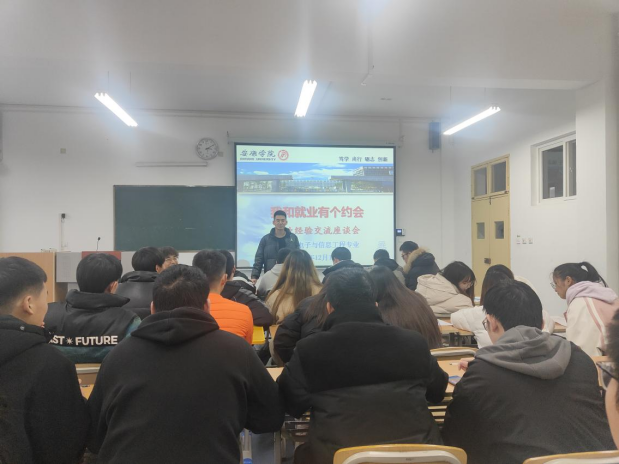 2021年12月11日下午,yl6809永利官网在江北校区教学楼1318教室召开了“我和就业有个约会”为主题的就业经验交流座谈会。此次交流座谈会邀请了2018级两名已经成功就业的学生分享他们的求职经历,电子信息工程专业的毕业班全部学生参加了此次会议。会议由辅导员成英丽老师主持。