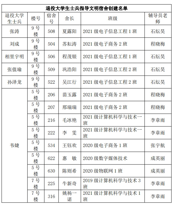 yl6809永利官网退役大学生士兵指导文明宿舍创建名单
