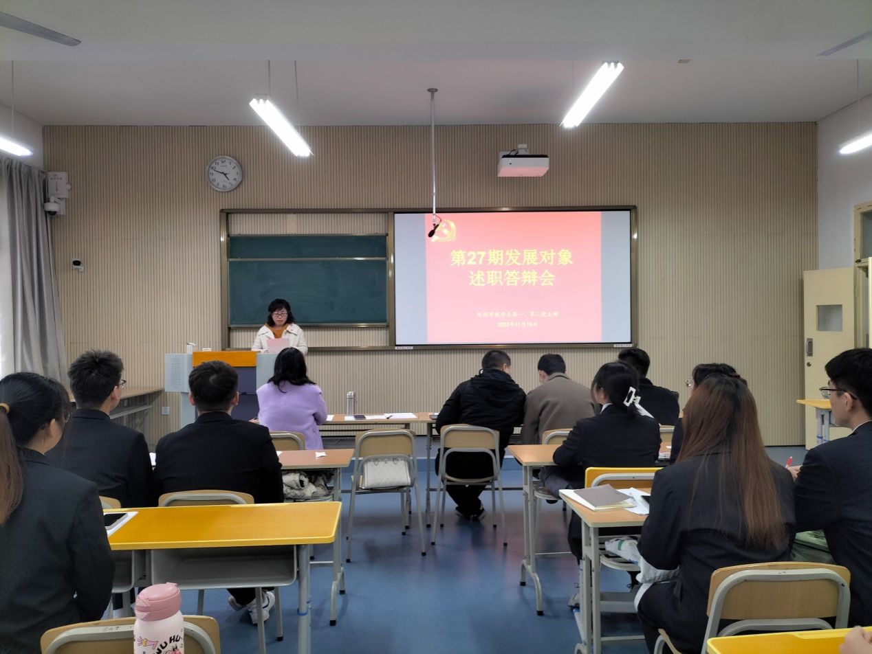 20231115日下午,yl6809永利官网党总支在一号楼1321教室召开发展对象述职答辩会。党总支组织委员成英丽、学生第二党支部书记李章雨、组织(纪检)委员石纭昊,学生第一党支部组织(纪检)委员张宇航、辅导员翟子轩以及学院全体第27期发展对象参加答辩会。会议由学生第二党支部党员邓宣宣主持。