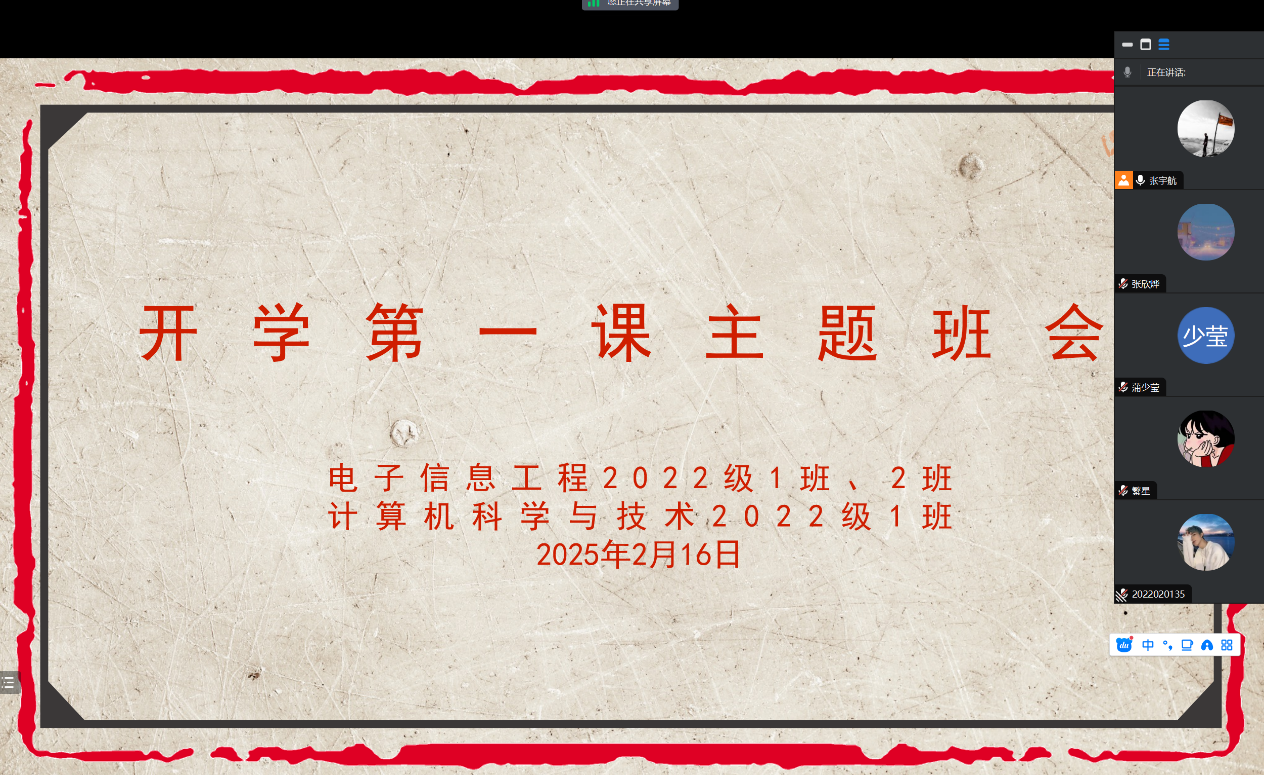 为扎实推进yl6809永利官网2025年春季新学期工作开好局、起好步,引导学生做好新学期规划,做好学生返校后的安全教育工作,2月16日,yl6809永利官网全体辅导员组织所带班级分别通过线上和线下相结合的方式召开了新学期主题班会,全体学生参会。