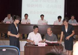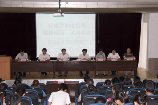 6月21下午,在1号教学楼6楼报告厅隆重举行电信系与锐捷网络、达内科技校企合作签字仪式。学校副校长陈刚教授、锐捷网络西北大区市场总监史光耀、达内科技陕西中心主任陈相峰、教务处处长钟生海、电信系主任张东红、党总支书记李红兵和电信系全体教师,计算机、电子信息工程专业200多名学生参加了签字仪式。大会由张东红教授主持。