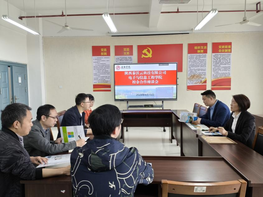 2024年4月15日,为进一步落实落地《安人才办发[2023]2号》“百名博士助百企”科技服务活动,经前期交流对接,陕西泰沃云科技有限公司董事总经理孔恩明一行到访yl6809永利官网,举行校企合作座谈会。会议由王克刚副院长主持,yl6809永利官网各系主任、实验中心副主任,以及校级科研平台大数据与智能信息处理研究中心主任参加座谈。