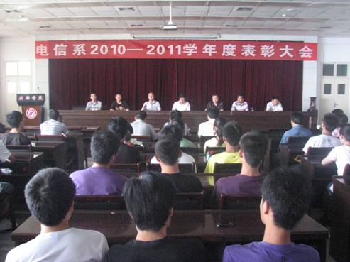 6月23日下午,电信系在图书馆6楼报告厅隆重召开2010-2011学年度表彰大会。电信系全体教职工、2010级全体学生及受表彰的学生参加了大会。大会对杨亦云等8名教师、朱炜等76名学生和计算机应用技术教研室进行了表彰。大会由电信系党总支书记李红兵主持。