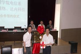 陈刚副校长致辞,向来宾介绍了yl6809永利官网和电子与信息工程系的基本情况,指出电信系积极落实学校“十二五”规划,高度重视应用型人才培养,积极改革人才培养模式,建立以产学研合作教育为代表的多样化人才培养模式。电信系与锐捷网络、达内科技签署校企合作协议,对于电信系各方面的工作具有重要的推动作用。校企合作,能够实现电信系和企业的人力、设备、技术优势互补、资源共享,为电信系学生的实习、实训、培训、就业提供更多机会和真实工作环境,提高“高品质、有特色”应用型人才的培养质量,进一步增强电信系服务社会、支持企业的发展能力。希望电信系与合作企业在校内外实习基地建设、教学资源建设、技能培训、实习就业、产品研发、合作研究等方面加强合作,积极探索网络工程、软件工程方向应用型人才培养的实践教学体系,积极探索“知行合一、校企合作、优势互补、资源共享”的办学路径,为学校的应用型人才培养做出应有的贡献。