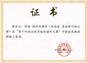 由教育部教育管理信息中心主办的第十四届全国多媒体课件大赛决赛于11月10日在北京大红门国际会展中心落下帷幕,我校电信系教师杨亦云、数统系教师刘铁合作的参赛作品“角动量角动量守恒定律”获得高教理科组全国三等奖,这是我校教师在该项赛事中首次获奖。