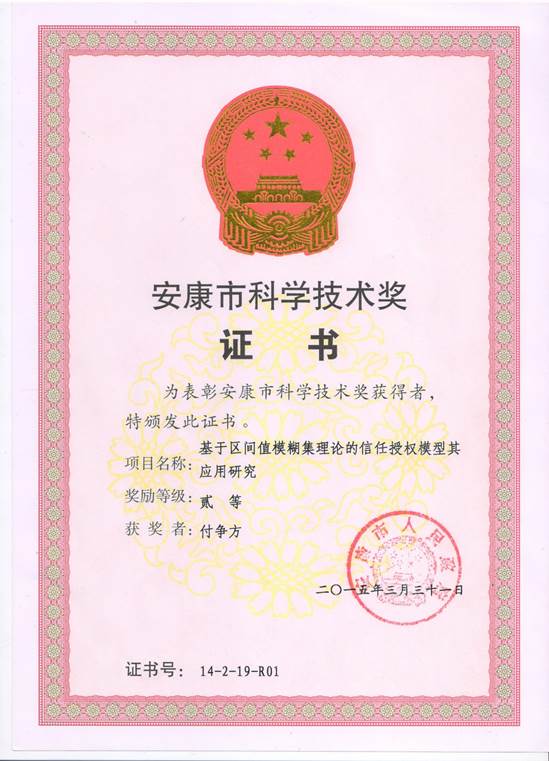 2015年3月31日,接安康市人民政府通知,由我院作为第一完成单位、电信系教师付争方副教授主持的“基于区间值模糊理论的信任授权模型及其应用研究”项目荣获安康市科学技术二等奖,同时获得该项奖励的我系教师还有:张东红、徐江涛、任秦安、成典勤。
