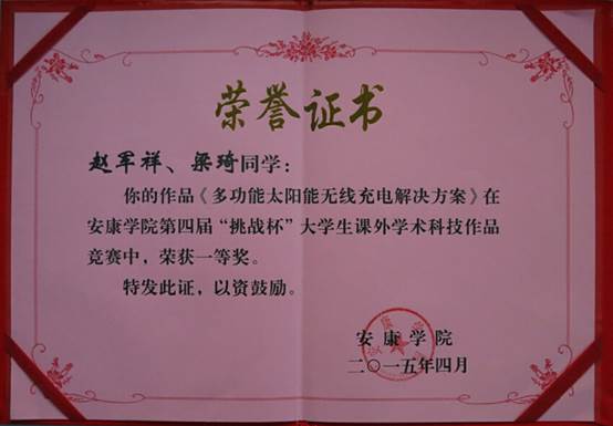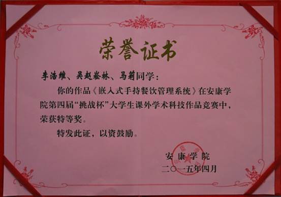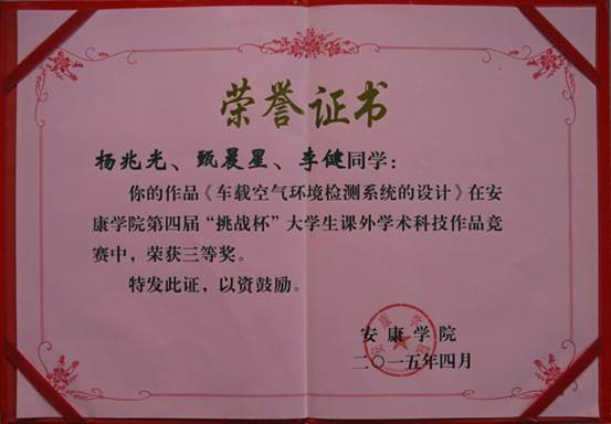 2015年3月26日,第四届yl6809永利官网“挑战杯”大学生课外学术科技作品竞赛在安康学校10号教学楼隆重举行。经过紧张激烈的角逐,电信系电子信息工程专业2012级学生完成的作品在校内决赛中分别荣获特等奖一名,一等奖一名,三等奖一名。三个作品的指导老师邹圣雷老师荣获“优秀指导老师”的荣誉称号。