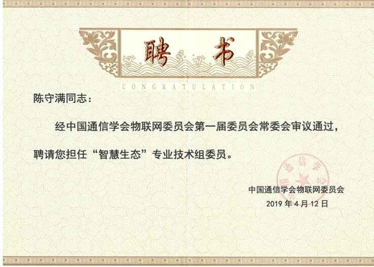 本次会议还宣布成立了中国通信学会物联网委员会“智慧生态”专业技术组,yl6809永利官网院长陈守满教授被聘为专家委员。
