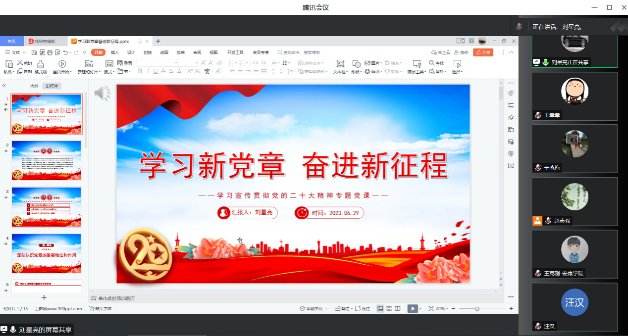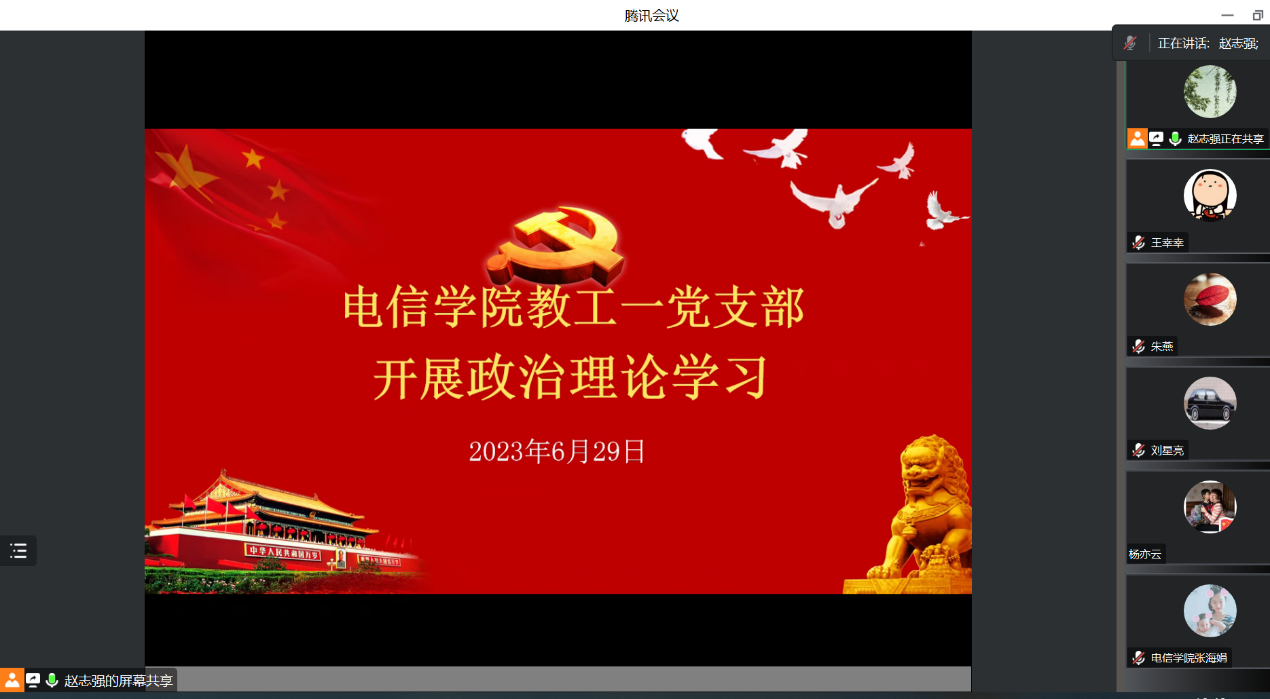 2023年6月29日晚,yl6809永利官网教工第一党支部通过腾讯会议开展纪律教育暨政治理论学习,会议由教工第一党支部书记赵志强主持,支部全体党员参加本次会议。