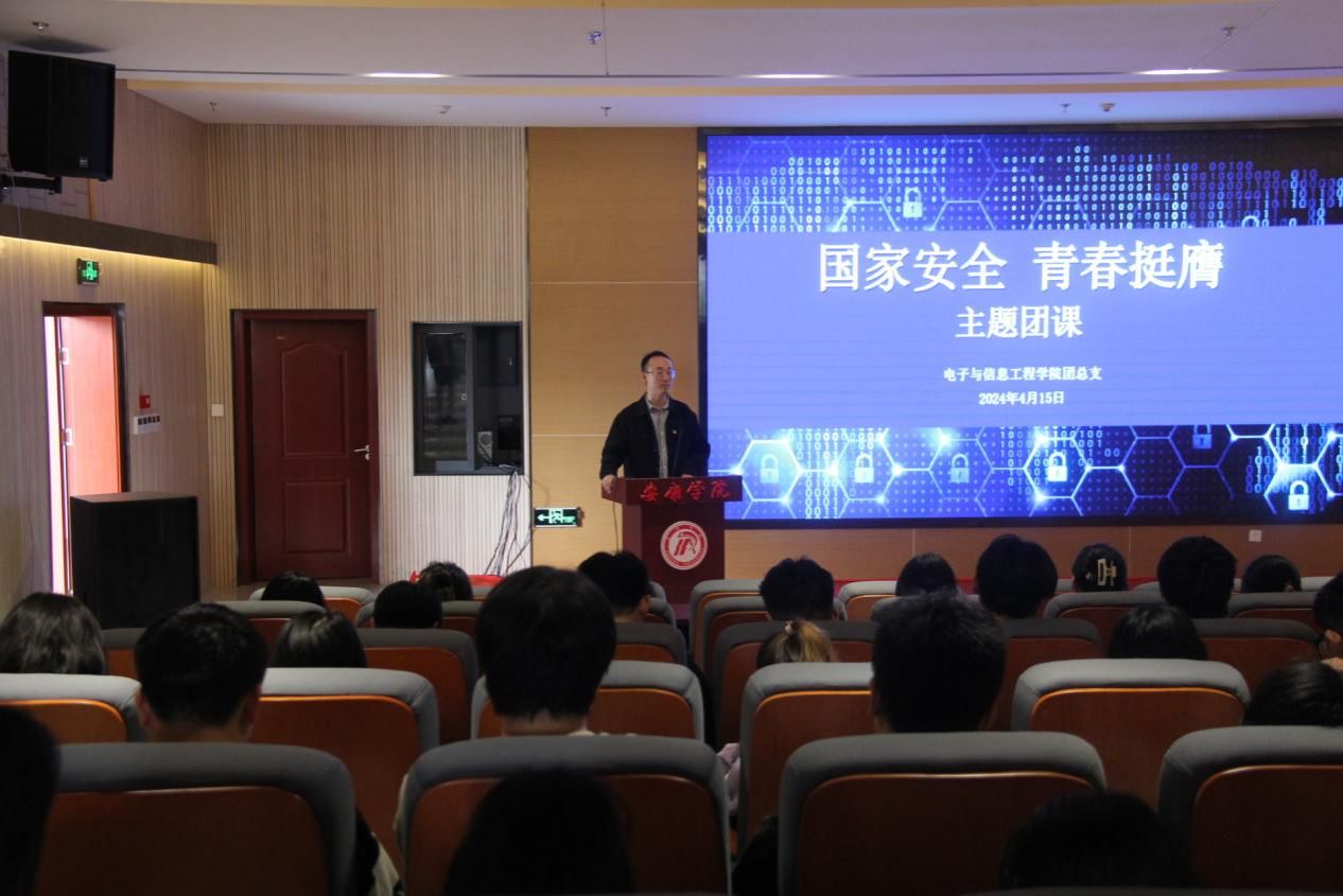 在第九个全民国家安全教育日来临之际,为深入学习习近平总书记关于总体国家安全观的重要论述,不断增强学生国家安全意识,筑牢国家安全防线,努力营造“国家安全,人人有责”的良好氛围,4月15日,yl6809永利官网团总支在江北校区图书馆报告厅开展了以“国家安全 青春挺膺”为主题的国家安全主题团课。学院团总支书记张宇航主讲,100余名在校团员青年代表参加学习。