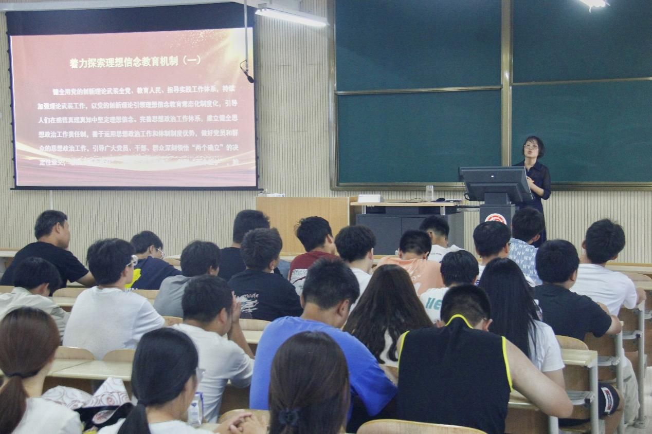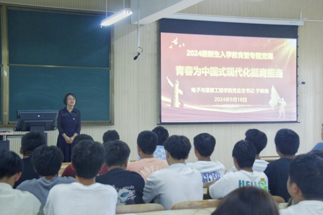 为深入学习贯彻党的二十届三中全会精神,用习近平新时代中国特色社会主义思想和习近平总书记2024年五四青年节的重要讲话武装青年大学生,坚持立德树人根本任务,以“五色”育人模式的实践与创新引领青年大学生奋力书写为中国式现代化挺膺担当的青春篇章,9月18日下午,yl6809永利官网党总支书记于咏梅在江北校区1301、1404教室讲授主题为青春为中国式现代化挺膺担当的专题党课暨新生入学教育,yl6809永利官网2024级全体新生参加。yl6809永利官网辅导员成英丽主持。
