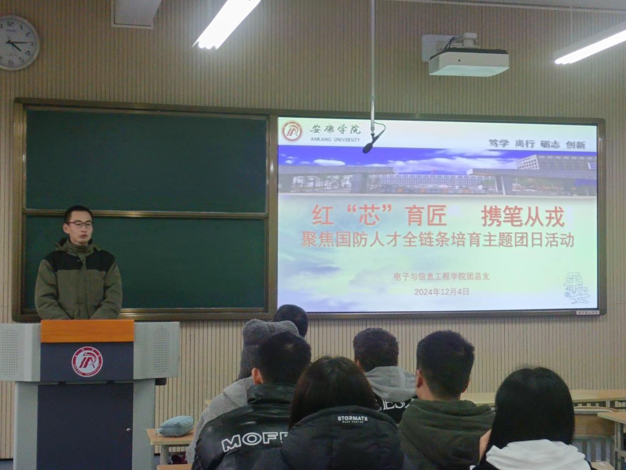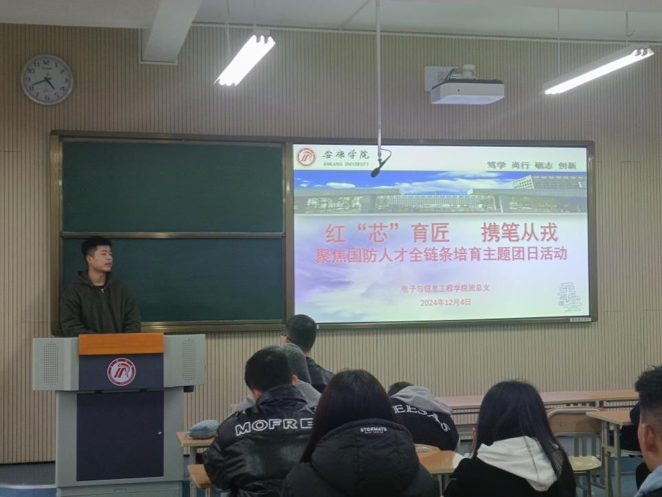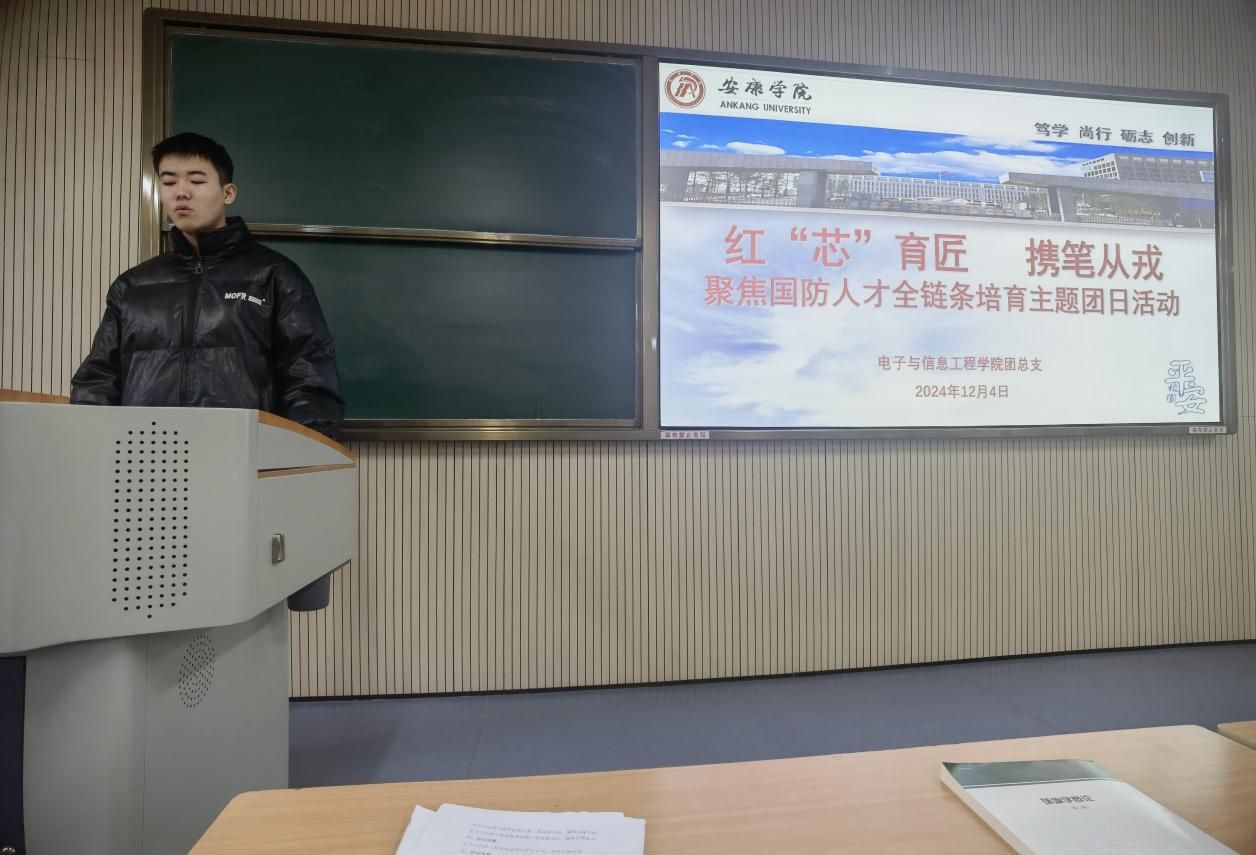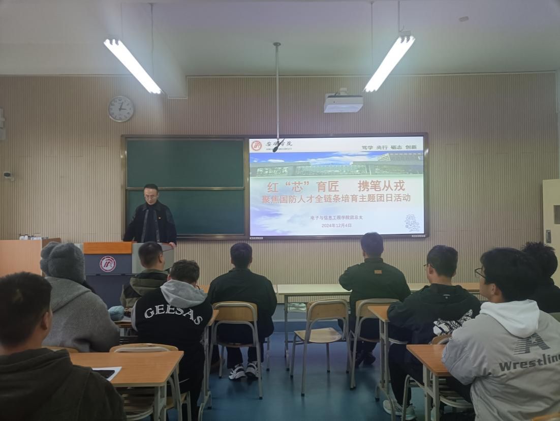 为聚焦退役大学生士兵回校后继续发扬部队‘特别能吃苦、特别能战斗、特别能奉献’的光荣传统和优良作风,引导“芯”青年牢固树立纪律规矩意识,自觉培养高尚道德情操,涵养清正廉洁的作风品行,动员更多符合强军需求的大学生青年投身国防事业,为部队输送更多有志青年。12月4日,yl6809永利官网以“红‘芯’育匠 携笔从戎”为主题开展聚焦国防人才全链条培育主题团日活动。学院党总支书记于咏梅、学生工作办公室主任石纭昊、团总支书记张宇航、党总支组织委员成英丽、学生第一党支部书记翟子轩、学生第二党支部书记贾金兵、全院退役大学生士兵及各班级主要干部参加活动。