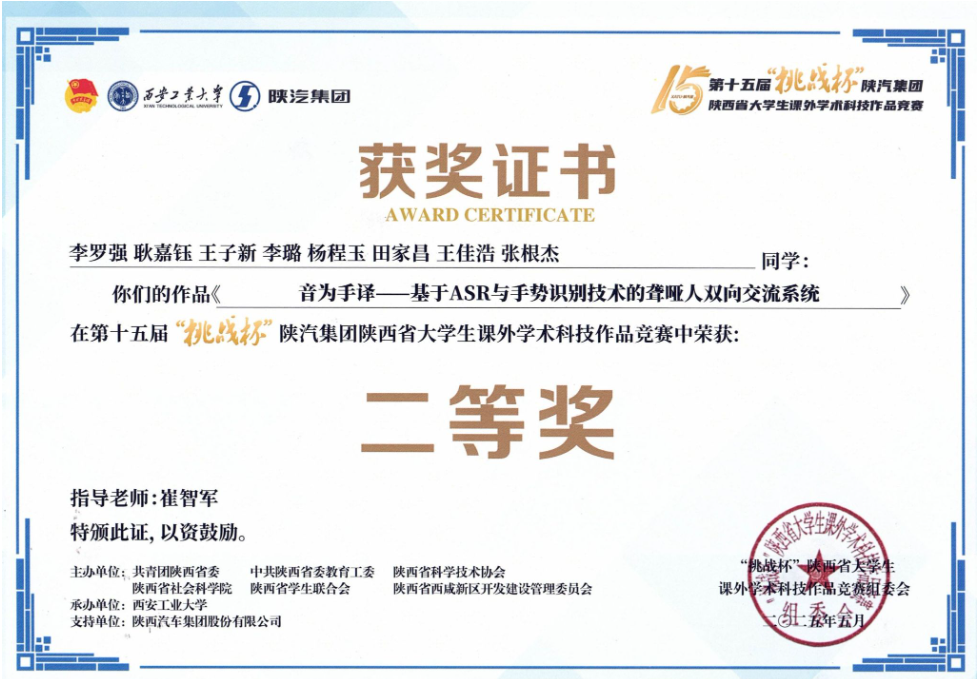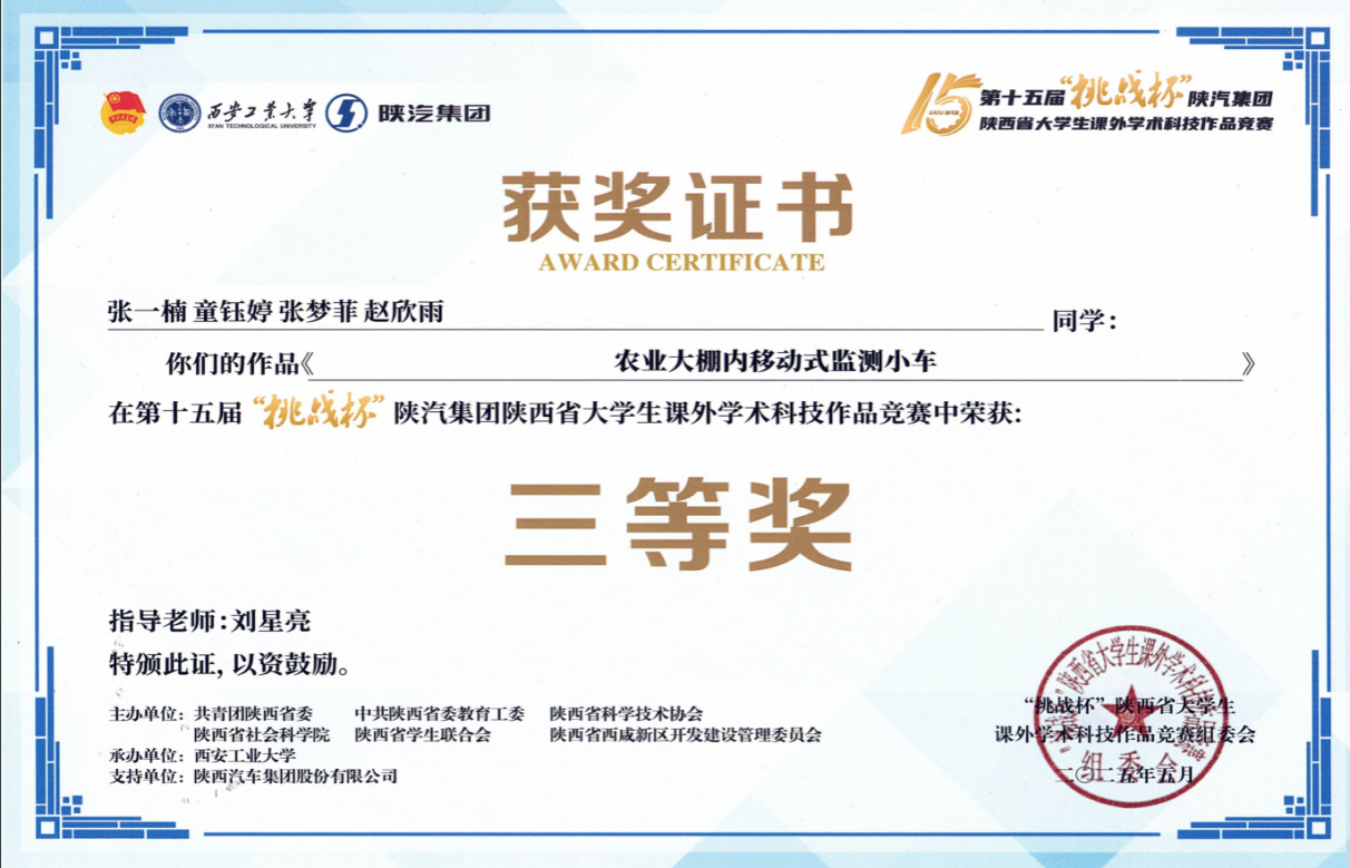 近日,由团省委、省委教育工委、省科协、省社科院、省学联与省西咸新区管委会联合主办、西安工业大学承办的第十五届“挑战杯”陕汽集团陕西省大学生课外学术科技作品竞赛落下帷幕。我院学子在竞赛中表现优异,取得二等奖1项、三等奖2项,展现了深厚的专业功底与卓越的创新实践能力。