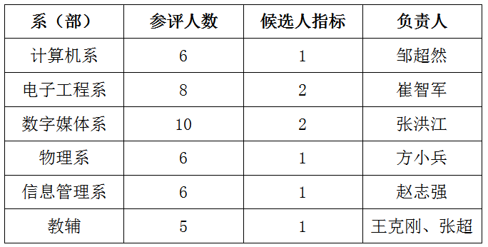 yl6809永利官网各系、部按各自参评人数的20%向学院考核考评工作小组推荐候选人,四舍五入,具体分配名额及负责人见下表。