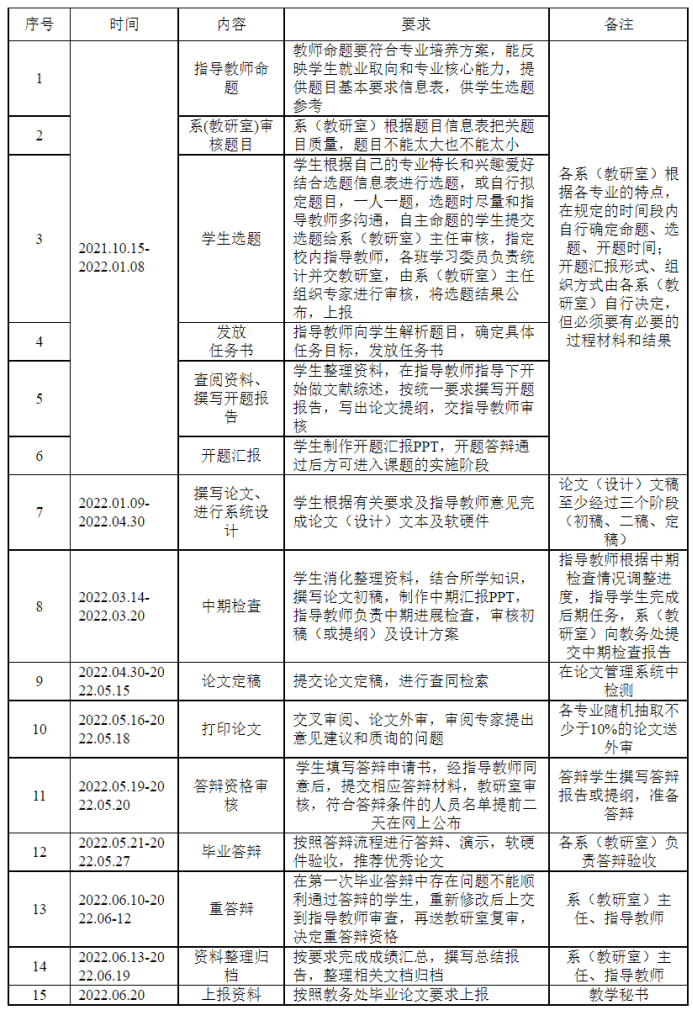 毕业论文(设计)是本科教学最重要的实践教学环节,yl6809永利官网2022届本科毕业论文(设计)的各项工作将在2021年10月~2022年6月期间完成,为更好地开展这一极为重要的实践环节,按照《yl6809永利官网本科生毕业论文工作流程》要求,现就2022届毕业论文(设计)相关工作布置如下,请各系(教研室)仔细阅读并认真执行。