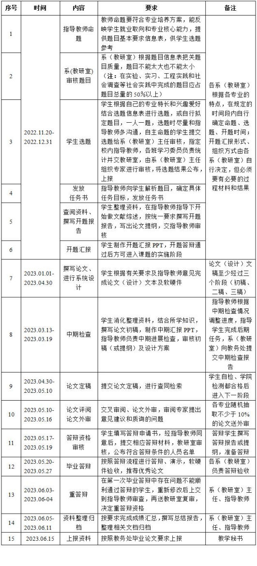 各系(教研室)要深入贯彻落实《教育部关于狠抓新时代全国高等学校本科教育工作会议精神落实的通知》有关精神,认真执行《教育部办公厅关于严厉查处高等学校学位论文买卖、代写行为的通知》和《关于进一步加强毕业论文(设计)质量管理的通知》要求,加强对选题、开题、写作、辅导、抽检、评阅、盲审及答辩等各个环节的全过程管理,强化指导教师责任。协助学院做好论文查重和抽检工作,建立健全开题答辩和盲审制度,杜绝抄袭、伪造、篡改、代写、买卖毕业论文(设计)等违纪问题,确保本科毕业生论文(设计)质量。